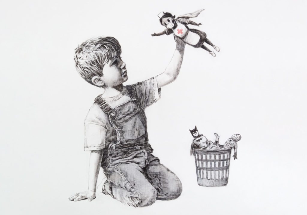 Un record d’asta fresco d’annata, stabilito da Christie’s Londra lo scorso 23 marzo. Game Changer rappresenta un bambino in bianco e nero che, in tempo di pandemia, abbandona in un cestino Spider-Man e Batman per sostituirli con una supereroina a mo’ di infermiera. Era stato esposto all’ospedale di Southampton in pieno lockdown, già nel maggio 2020, e poi messo in vendita su desiderio dell’artista per devolvere i proventi al servizio sanitario. La stima degli esperti, prima dell’incanto, era di “appena” £2.5-3.5 milioni ($3.5 – 4.9 milioni)