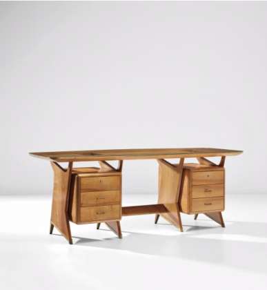 Protagonisti della vendita, i due tavoli-prototipo disegnati da Gio Ponti nel 1970, proposti con una stima di 30mila-50mila sterline. Provenienti da una collezione privata, i due tavoli (pieghevoli) da caffé rappresentano in pieno l’apporto innovatore del maestro. Molte altre le opere disegnate da Gio Ponti, come la scrivania in legno impiallacciato di noce, realizzata da Egidio Proserpio a Barzanò, o il lampadario realizzato con l’inclusione di foglie d’oro, realizzato da Venini & C. sull’isola di Murano.
