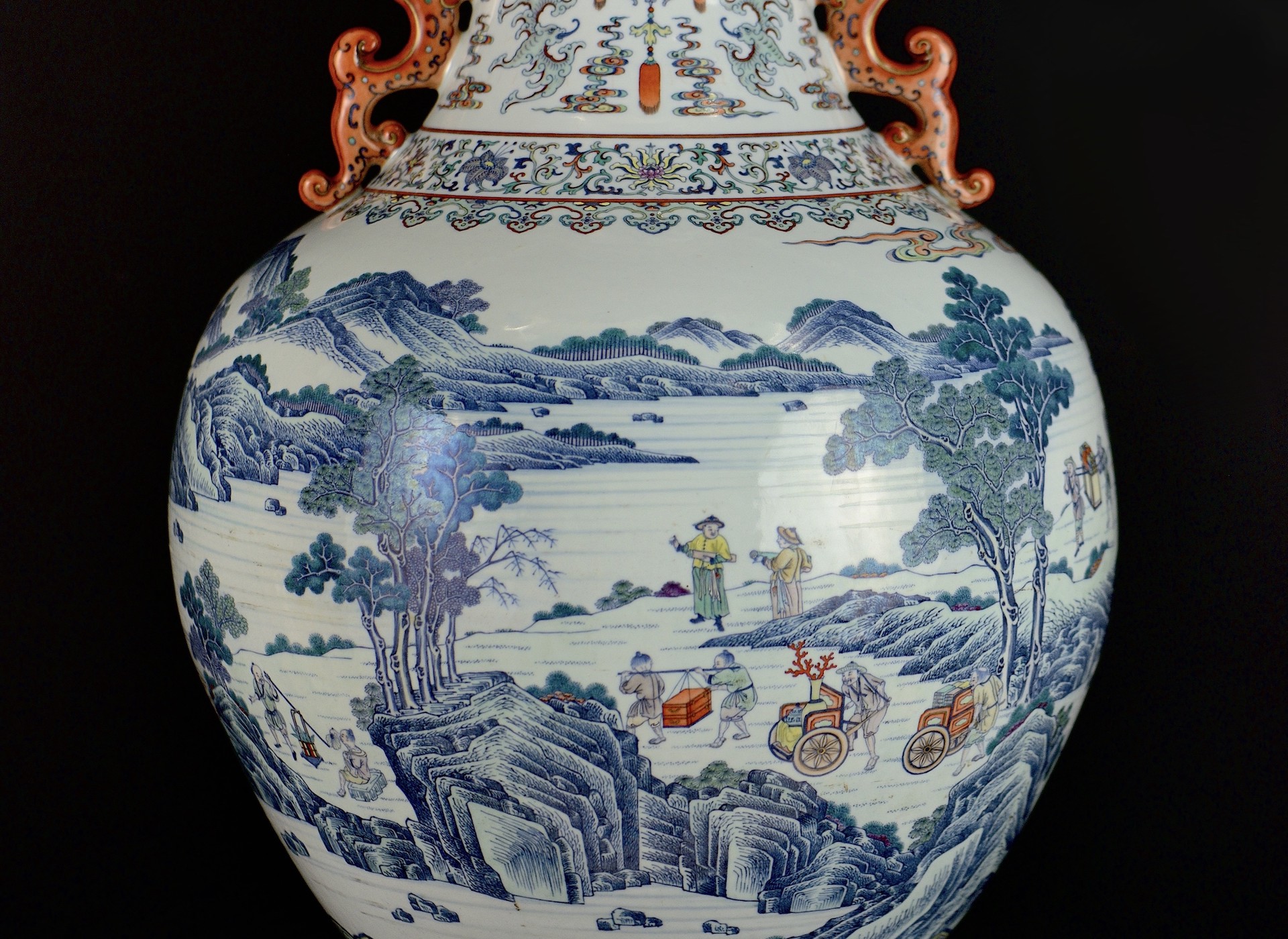 Ed ecco quindi il verdetto a sette cifre. Un risultato incredibile, ma non insospettabile, vista l’analogia con un esemplare della collezione del Museo del Palazzo di Pechino. Quello offerto dalla casa d’aste di Sanremo era un pezzo antico, elegante, prezioso: il collo impreziosito dalle doppie anse a guisa di testa di Idra, dai pipistrelli, i pesci e le piccole nuvole colorate; la spalla che riporta motivi floreali; la pancia caratterizzata da personaggi che si muovono tra montagne e grandi nuvole colorate, intenti a trasportare tesori e tributi nella Città Proibita, alcuni accompagnati da cavalli altri da elefanti e altri da animali fantastici; ancora, un’elegante serie di motivi floreali sul piede; mentre sul fondo a smalto bianco campeggia il marchio Qianlong a sei caratteri in blu.