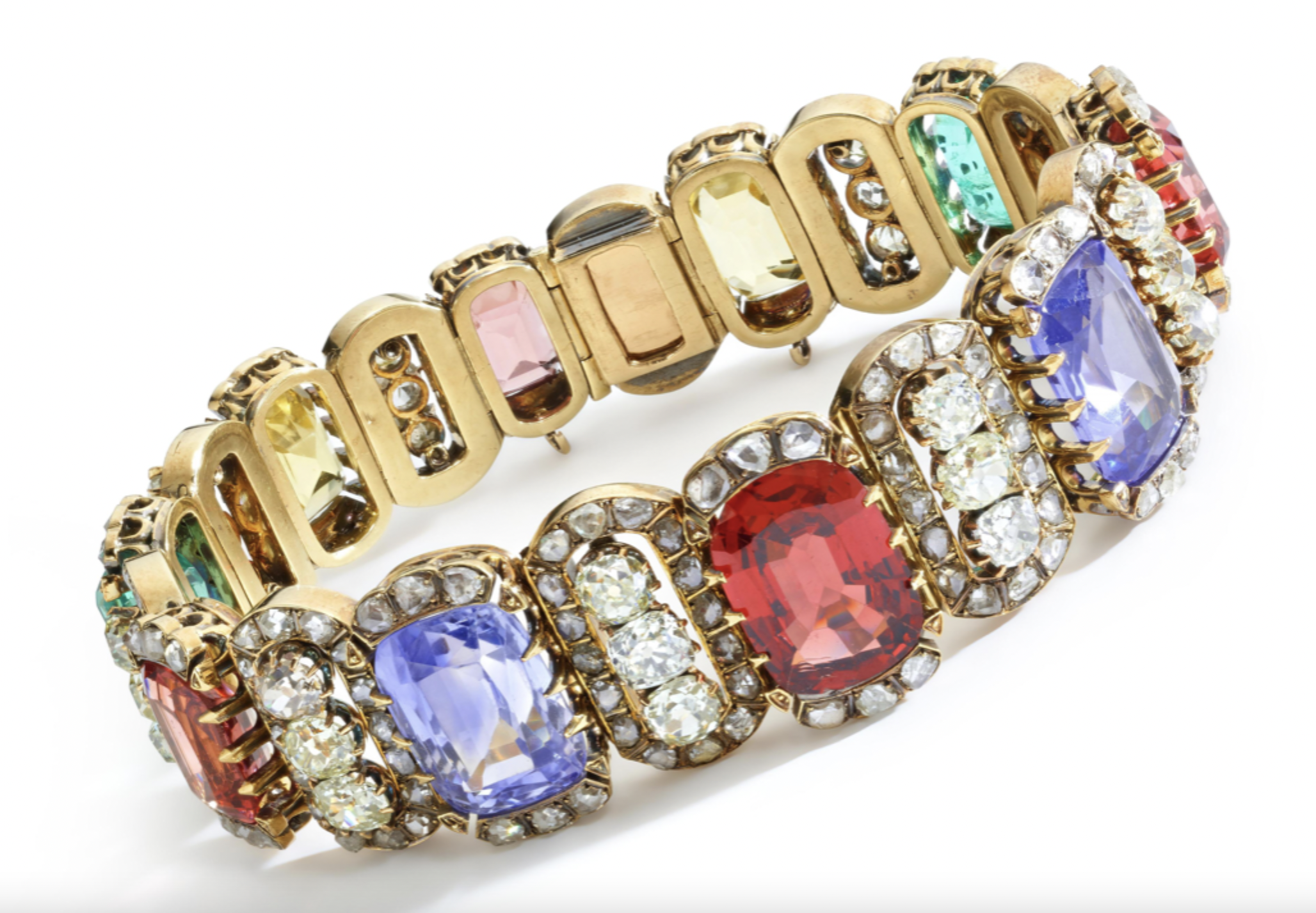 Firmato Eugène Fontenay, uno degli orafi di spicco del XIX secolo, è il lotto 1078, un prezioso bracciale del 1870 composto da zaffiri, smeraldi e zaffiri gialli, incorniciati da antichi diamanti. Appartenuto alla principessa Eudoxia, fu probabilmente ereditato dalla madre Maria Luisa di Borbone-Parma, a sua volta ereditato da Maria Pia di Borbone-Due Sicilie, nonna della principessa Eudoxia. Tramandato per generazioni, è ora in asta da Sotheby’s, a Ginevra, con la stima di $ 40.000–60.000.