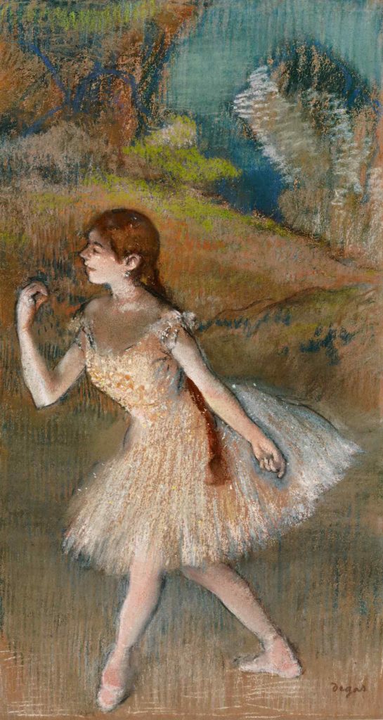 Proprio lì, tra quella confusione, Degas studiò le danzatrici che si esibivano in scena, le ritroviamo – tra i tantissimi esempi – nel pastello Danseuse au bouquet (1877) al Musée d’Orsay; ma si interessò anche a quelle sullo sfondo, che si intravedevano dietro alle teste de Gli Orchestrali, proprio come nel quadro esposto a Francoforte alla Städelsches Kunstinstitut und Stadtische Galerie (1872); e soprattutto alle Ballerine dietro le quinte, frenetiche, colte quasi per caso, come le protagoniste dell’opera al Museo Puškin di Mosca (1895).