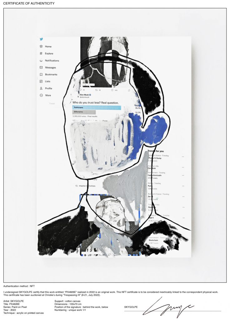 È la Crypto Arte, bellezza. O quello che ne rimane, in effetti, dato il crollo fragoroso degli ultimi mesi – avete già ascoltato il nostro podcast sul destino degli NFT? Eppure, pare, le vendite di Non-Fungible Token continuano a fare notizia. Come quella del certificato digitale di proprietà del dipinto PX4882E, che ha sfilato insieme alla rispettiva opera fisica nel corso dell’incanto Trespassing III di Christie’s. L’autore? L’artista italiano Skygolpe, classe 1986. Il prezzo? $ 69.300, a partire da una stima di $ 30.000-50.000. E abbiamo anche il nome dell’acquirente, stavolta: il noto collezionista 33nft.