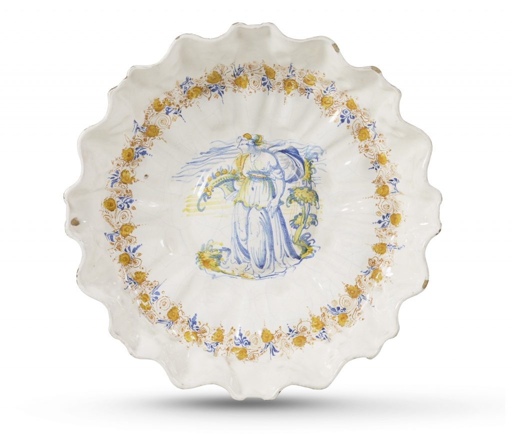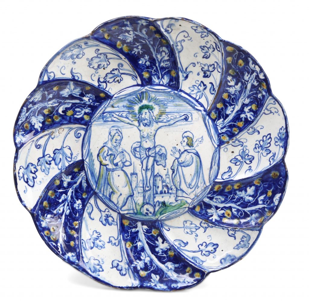 Qualche esempio? La coppa di Montelupo, eseguita a metà del XVI secolo, decorata nel recto con la scena della Crocifissione. Attorno, nella tesa, si dispongono eleganti partizioni che racchiudono tralci di quercia stilizzati su fondo bianco e blu nel genere cosiddetto “a quartieri”. «Siamo in presenza un’opera il cui primo punto di interesse risiede nell’avere un’alta valenza collezionistica», riporta la scheda di catalogo, «essendo appartenuta ad una prestigiosa collezione europea, quella di Eugen Miller von Aichholz (1835- 1919), mecenate austriaco che a Vienna costituì un’ importante collezione d’arte, composta principalmente di oggetti del Rinascimento italiano». La stima è di € 8000-15.000.