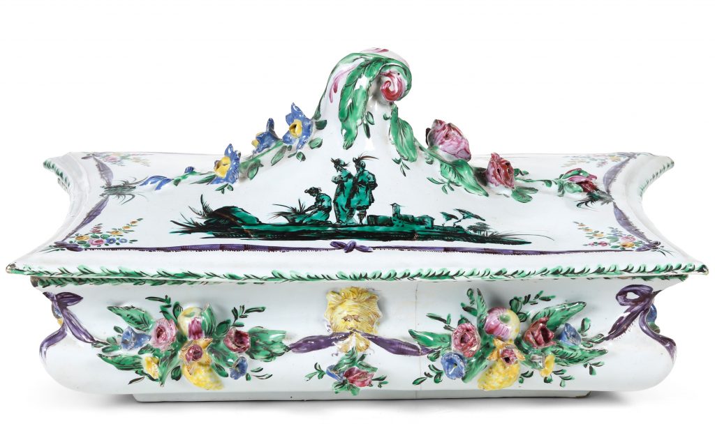 È un viaggio attraverso i secoli, quello proposto da Cambi: il Settecento è rappresentato, tra gli altri, da una rara legumiera faentina dipinta da Filippo Comerio presso la Fabbrica Ferniani. «Da segnalare che l’opera da un punto di vista collezionistico era un tempo presso la prestigiosa raccolta Crespi di Milano», riporta la scheda di catalogo. Poi, a proposito della cifra stilistica dell’artista: «Qui il pittore manifesta la sua inconfondibile maniera in due scenette dipinte sul coperchio, confermandosi interprete geniale del gusto arcadico, tradotto con freschezza di tocco e sobrietà cromatica: scenette animate da caratteristiche “macchiette” disegnate in bruno e con campiture in verde liquescente, di tenerezza acquosa, che il bianco di fondo rende in molti punti trasparente e luminoso. Inoltre, assolutamente originale di quest’opera è la voluta della presa, slanciata come un’onda verticale, arricchita alla base da elementi floreali plastici, in cui spiccano rose naturalistiche di color rosso porpora, ripresi anche sulle pareti esterne della conca: gli stessi che la fabbrica applicava come eleganti elementi accessori, in altre forme “chiuse”, specie nelle prese delle zuppiere». La stima: € 3000-5000.