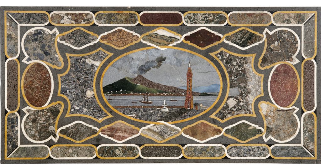 Quindi, Napoli, prima tappa di questo viaggio immaginario. Pietro Fabris restituisce la vitalità della vita partenopea del Settecento negli splendidi paesaggi animati da scene di genere e convivialità, mentre l’Eruzione del Vesuvio di notte di Giovan Battista Lusieri e la luminosa Veduta di Napoli dal mare di Orazio Grevenbroeck celebrano la natura e il dramma dell’eruzione del Vesuvio. Accanto alla pittura, lo spirito inventivo napoletano emergono raffinati tavoli in scagliola, e un piano in commesso di pietre vulcaniche, delicate porcellane e preziosità come un cofanetto in piqué d’oro e tartaruga. «Opere che testimoniano l’ingegno degli artigiani locali», le definiscono da Sotheby’s, «le cui creazioni divennero simboli di raffinatezza ricercati in tutta Europa».