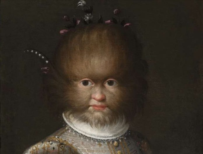 La storia è questa: sul finire del Cinquecento, Lavinia Fontana ritrasse il volto di Antonietta Gonzales, la giovane alla corte di Enrico II di Francia che soffriva di ipertricosi, la “sindrome del lupo mannaro” – e la cui vita, insieme a quella dei genitori, ispirò la favola de La Bella e La Bestia, se il racconto dovesse sembrarvi familiare. La ritrae con un vero e proprio “certificato” tra le sue mani, un’iscrizione che racconta la sua storia: Dall’Isole Canari fu con / dotto al Re Enrico II di fra. / D. Pietro Huomo selvatico che / di presente se trova presso al Ser.mo / Duca di Parma dal qual naqui io / Antonietta et hora me trovo a presso / Alla Sig.ra donna Isabella Pallavicina / Sig.ra marchesa di Soragna 159(?).