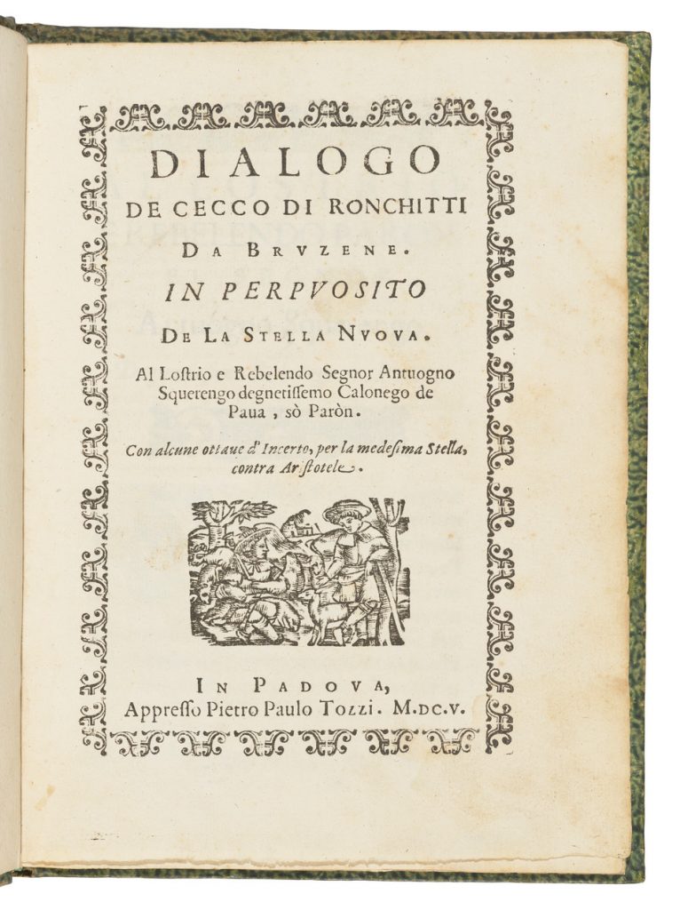 GALILEO GALILEI (1564-1642) e Girolamo SPINELLI (c.1580-1647). Dialogo de Cecco di Ronchitti da Bruzene. In perpuosito de la stella nuova. Padua: Pietro Paulo Tozzi, 1605. CHRISTIE’S IMAGES LTD. 2025