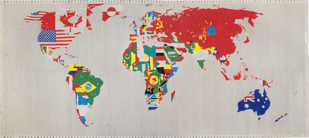 Record annunciato, record doppiato. Sotheby’s batte Christie’s, che appena un mese fa, a Parigi, fissava un nuovo traguardo da € 5,6 milioni (qui). E che già nel 2021, a Londra, superava dopo 7 anni il titolo incontrastato di Colonna ($ 3,9 milioni) con la sua Sottrazione da $ 4,6 milioni (qui). Ma è già storia vecchia, nel tempo famelico del mercato. Nella Grande Mela, stanotte, l’unica Mappa su sfondo avorio di Alighiero Boetti – la più grande conosciuta, 259 x 580 cm di grandezza, appartenuta nientemeno che alla Fondazione Carraro – polverizza senza scampo tutti gli illustri predecessori. Esito finale: $ 8,8 milioni. In ottima compagnia con gli $ 85,4 milioni per White Disaster (White Car Crash 19 Times) di Andy Warhol, uno dei prezzi più alti mai raggiunti per un’opera dell’artista in asta; ma anche per un Untitled di Willem de Kooning proveniente dalla De Kooning Family Collection, che ha chiuso partita a quota $ 34,8 milioni. «Questa Mappa», diceva prima dell’incanto Claudia Dwek, Chairman, Contemporary Art, Europe, «è senza dubbio l’opera più significativa e magnifica della importante serie creata da Boetti». Detto, fatto.