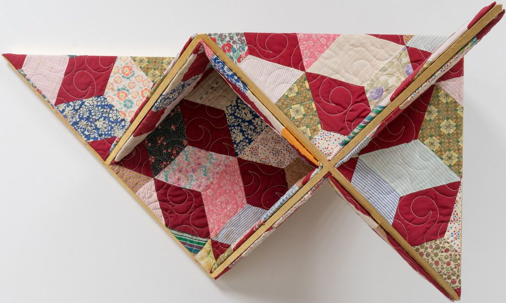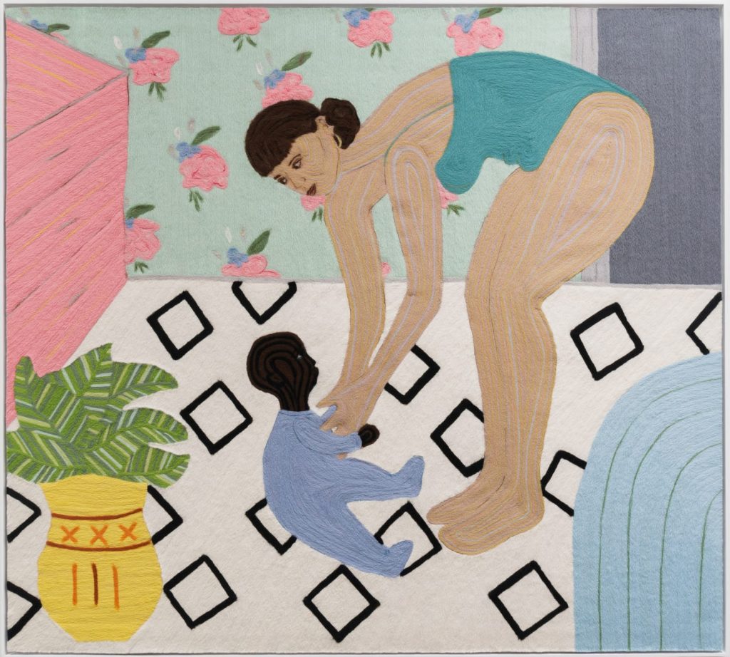 Riportiamo qui un’intensa descrizione di Cheryl Pope sul lavoro esposto all’EXPO CHGO ONLINE, realizzato in lana, cashmere e cornice di legno dipinto: «Nella mia opera il bambino ha inventato un gioco, lascia il tappetino blu solo per sedersi lontano e struggersi per il ritorno e il soccorso della madre. Sono affascinata da questa navigazione continua, da questa distanza misurata, con una madre e un bambino che percorrono la linea dell’amore».
