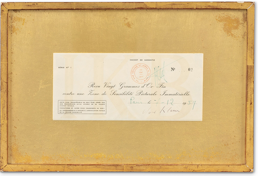 – Sotheby’s Parigi ha battuto mercoledì un’opera invisibile di Yves Klein per oltre € 1 milione (la stima era di € 300-500mila). O, meglio, la ricevuta che ne garantisce la proprietà. Vi suona familiare? Per qualcuno, Zone de sensibilité picturale immatérielle Série n°1, Zone n°02 (receipt to Jacques Kugel), del 1959, è il precursore ideale degli ormai ultra noti NFT. Un certificato di autenticità – e di esistenza, in questo caso, una convalida a 360 gradi.