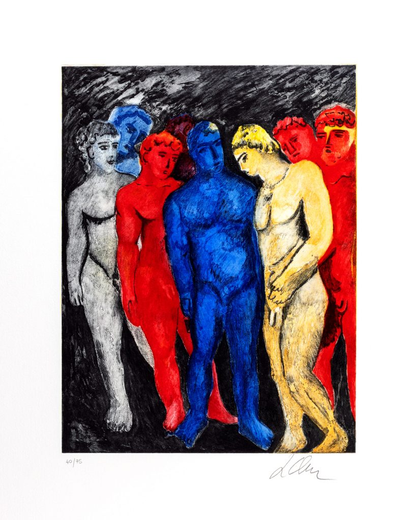 Daniel Spoerri sfila poi tra i lotti dell’incanto con una delle sue celebri tavole imbandite, un’acquaforte e acquatinta che riassume il senso del tempo. Emilio Vedova – che, per dirla con le parole di Germano Celant, «non si dispiega in maniera addomesticata, ma per collisioni e frizioni» – partecipa invece con un trittico carico della sua pittura violenta, impulsiva, straordinariamente gestuale. E non mancano infine lavori di altri artisti internazionali, realizzati dal laboratorio Berardinelli o presso altri studi d’eccellenza, come Chia, Beuys, Echaurren, Cucchi, Schifano, Crepax, Rotella, Scanavino, Carmi e Capogrossi (qui il catalogo completo).