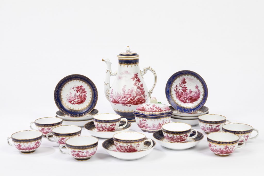 composto da caffettiera, zuccheriera e dieci tazze con piattino. Decoro a “paesi in porpora rossa” entro bordi blu con motivi dorati a rilievo, la caffettiera con versatoio zoomorfo ed ansa a doppia voluta, la zuccheriera di forma mossa e bombata con presa del coperchio a frutto, le anse delle tazze a racemi intrecciati (lievi difetti) . Stima € 2.000 – 3.000