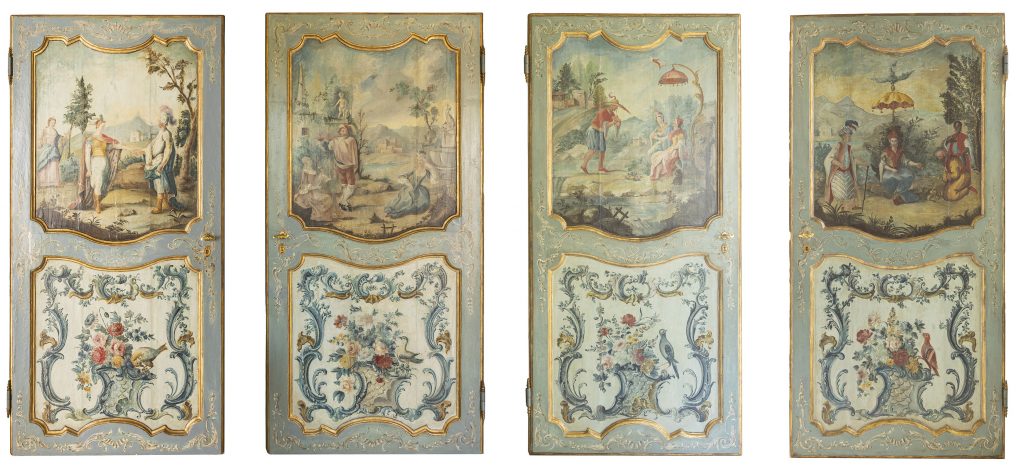 decorate con due riserve sovrapposte, quelle superiori con scene animate in paesaggio romantico, le inferiori con motivo floreale e un uccellino entro un cartiglio rocaille