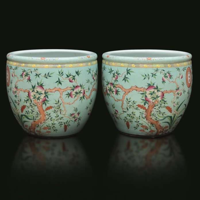 Importante, in catalogo, anche una coppia di imponenti cachepot in porcellana Doucai, decorati con motivi Ruyi e floreali, risalenti alla Dinastia Qing, periodo Daoguang (1821-1850), la valutazione qui è di € 50.000-70.000. Mentre una coppia di cachepot in porcellana policroma su fondo celeste con decori a rami di pesco della Dinastia Qing, marchio Yazhai (1874-1876), potrebbero trovare casa per € 40.000-60.000. Spicca poi una bella selezione di sculture e oggetti sacri, tra cui una straordinaria testa di Bodhisattva scolpita in pietra, proveniente dal Gandhara e risalente al IV secolo (stima: € 12.500-14.500). Una figura di Guanyin in bronzo, su doppio fiore di loto, della Dinastia Ming (1368-1644), passa al vaglio del martello con un pronostico di € 8.000-12.000.
