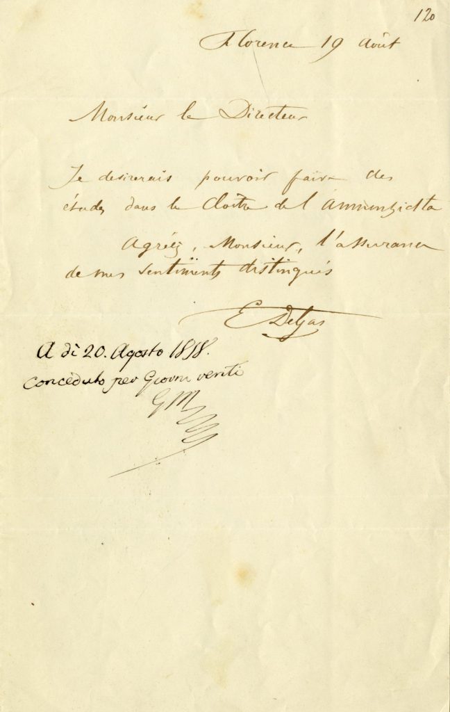 – Lotto 22, 1858, la storia è questa: il 24enne Edgar Degas si trova in Italia, a Firenze, spera di vedere e studiare dal vivo le opere degli illustri maestri italiani. Scrive una lettera per ottenere l’ingresso al Chiostro dell’Annunziata, scrigno – tra le altre – di una pala del Bronzino, la celebre lunetta di Andrea del Sarto, un’Assunzione del Perugino. «Florence 19 août, Monsieur le Directeur», dice, «je désirais pouvoir faire des études dans le Cloitre de l’Annunziata. Agréez monsieur […]». La risposta del direttore: «A dì 20 agosto 1858 conceduto per giorni 20 G.M.». Permesso accordato. Oggi, da Gonnelli, la base d’asta è di € 300.