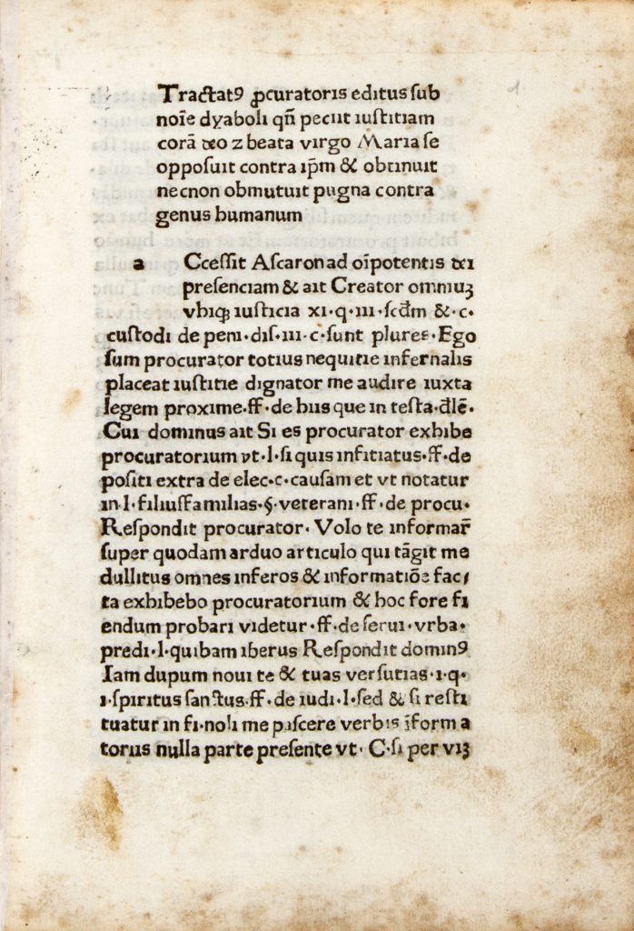 – Lotto 342. Da un lato il demonio in persona, che va in paradiso per riconquistare la sua umanità; e poi la Vergine, davanti a Cristo nelle spoglie di giudice. Un processo in forma di dialogo fra il diavolo, Cristo e la Madonna. Più di preciso, la quinta edizione del Processus satane, un mix perfetto di teatro, letteratura, diritto e teologia, variamente attribuito a Bartolo da Sassoferrato. Neanche a dirlo, sarà messo all’Indice dall’Inquisizione. La data: 1475. La base d’asta: € 2000.