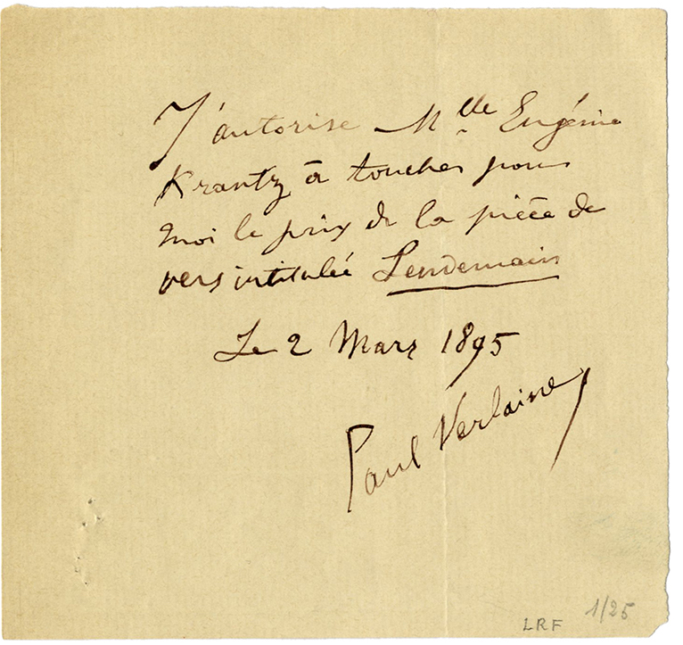 – Lotto 51, ancora un testimone (silenzioso) di storie. È un biglietto scritto e firmato da Paul Verlaine, pochi mesi prima della sua morte, recita così: «J’autorize M.lle Eugénie Krantz à toucher pour moi le prix de la piéce de vers intitulée Lendemain. Le 2 mars 1895. Paul Verlaine». Eugénie Krantz, l’ultima amante del poeta maledetto, «una donna dall’aspetto piuttosto sgradevole», scrisse St Georges de Bouhélier, «con il viso rubicondo cosparso di rughe, occhi piccoli, malvagi». Era una prostituta, la chiamavano Nini-Mouton. Lui – lo rivelò nelle sue lettere – non poteva fare a meno di lei. Base d’asta: € 600.