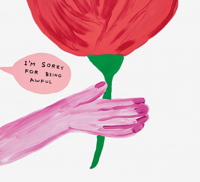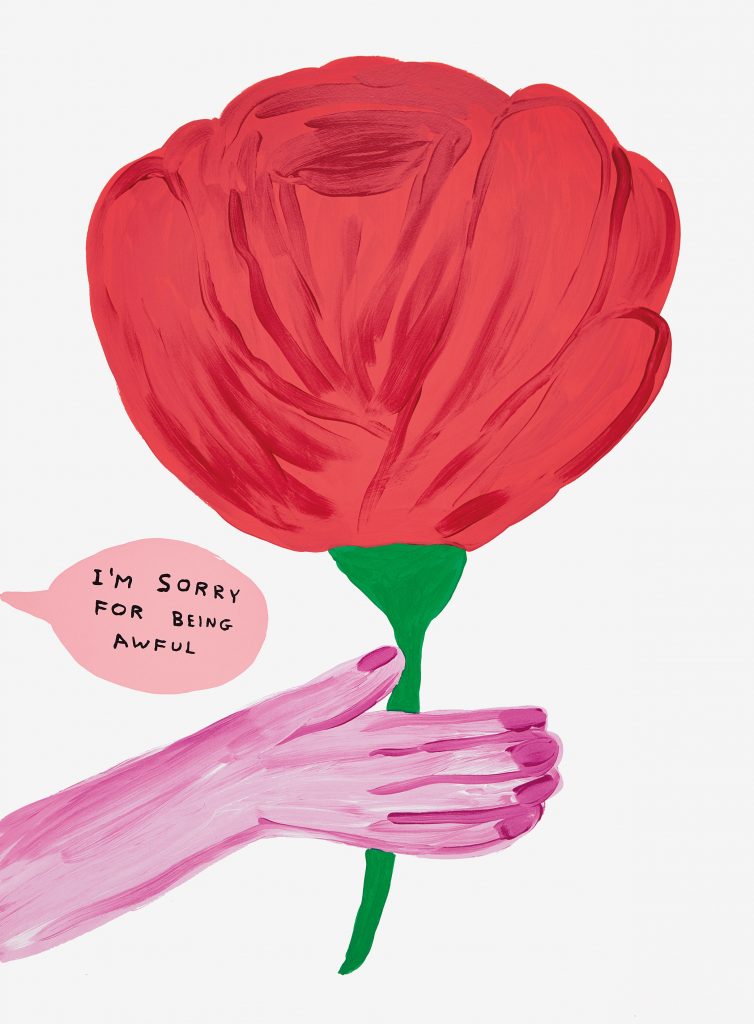 Nemmeno un anno fa, la casa editrice Chronicle Chroma pubblicava il suo libro, irrimediabilmente ironico fin dal titolo: Get Your Shit Together, recitava la copertina. Il contenuto, altrettanto non ordinario: una sfilza di figure a colori semplici, immediate, a un primo sguardo sembrano disegni di un bambino. Poi subito quello humor dissacrante che le accompagna, che fa a pugni con una visione fanciullesca del mondo – non c’è nulla di incantato in quelle scenette a tinte accese quotidiane. L’artista britannico David Shrigley esprime disagi, inquietudini universali, li traduce in immagini essenziali, in scritte accattivanti, sparpagliate intorno alle sue figure. «Devo aver fatto più di mille disegni dall’inizio della pandemia», commentava all’uscita del suo libro, «ho un bisogno un po’ compulsivo di elencare e tracciare tutto». Ogni giorno, i suoi gatti, le sue giraffe rosse, le sue orche speranzose rimbalzano tra social network di addetti ai lavori e profani, a metà tra opere d’arte, meme ricercati, forse tutto insieme. Ed ecco la notizia: Phillips mette all’asta alcune delle opere più celebri in una vendita online fino al 14 giugno, sotto forma di serigrafie. Qualche esempio? Una bottiglia in bilico sul bordo del tavolo (la scritta d’accompagnamento: «Are you confortable with this?», a prova di brivido). Stima: £ 5000-7000. La famosa oca rosa con le ali dispiegate: «Stop panicking, everything will be fine», sembra urlare (stima: £ 30000-5000). E ancora la foca verde che odia tutti gli esseri umani (stima: £ 1500-2000), l’ostrica motivatrice («You are special», stima: £ 2000-3000), l’invito a estrarre il «succo» da ogni situazione, con un’arancia come soggetto principale (stima: £ 1500-2000). Vi proponiamo qui alcuni dei pezzi più iconici, in attesa del verdetto finale.