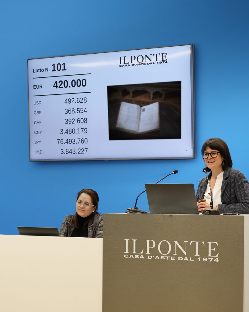 Non solo il codice delle meraviglie. L’asta di Libri antichi e d’artista, a Palazzo Crivelli, ha segnato un nuovo capitolo per il mercato librario nazionale, con oltre € 1,4 milioni di fatturato (record dipartimentale per singola asta), il 93% dei lotti venduti e una rivalutazione delle stime di partenza pari al 180%. Dal monumentale lavoro di Sir William Hamilton e Pietro Fabris, Campi Phlegraei (€ 38.400), fino al manifesto futurista di Tullio d’Albisola, L’Anguria lirica (lungo poema passionale), con illustrazioni di Bruno Munari e presentazione di Filippo Tommaso Marinetti (€ 30.720). «Il mercato ha reagito in modo diretto e deciso», riporta ancora il comunicato del Ponte, «con una partecipazione significativa dei collezionisti che ha determinato un risultato di vertice nel panorama nazionale».