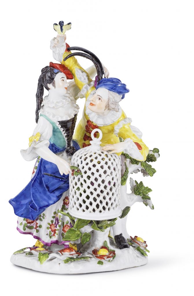 Tra le figure e i gruppi più ricercati del catalogo, composto da 55 lotti: il gruppo di amanti in crinolina massonica di Meissen del 1745 circa, stimato € 40.000-60.000 e precedentemente appartenuto al famoso collezionista svizzero Paul Schnyder von Wartensee; la figura di signora in crinolina di Meissen del 1737 circa, stimata € 20.000-30.000, un tempo nella collezione di Mrs. Charles E. Dunlap e considerata oggi una delle sue prime opere più raffinate e preziose; un gruppo di amanti di Meissen con una gabbia per uccelli del 1745 circa, con stima di € 40.000-60.000, raffigurante «un uomo con una gabbia per uccelli in cui c’è un pappagallo, accanto a lui una donna che dà al pappagallo ciliegie da mangiare e mette piume sulla testa dell’uomo, mentre lui le presenta una cinciallegra», così menzionato nei documenti di lavoro di Kaendler nel marzo 1741. Un altro esempio di questo gruppo si trova al Metropolitan Museum of Art di New York. Infine, tra i lotti più attesi, c’è anche il raro vaso Meissen di grandi dimensioni dipinto in stile Kakiemon intorno al 1730, proveniente dalla collezione del primo ministro della Sassonia e direttore della manifatturiera di Meissen Heinrich Graf von Brühl. Un’opera stimata € 20.000-30.000.