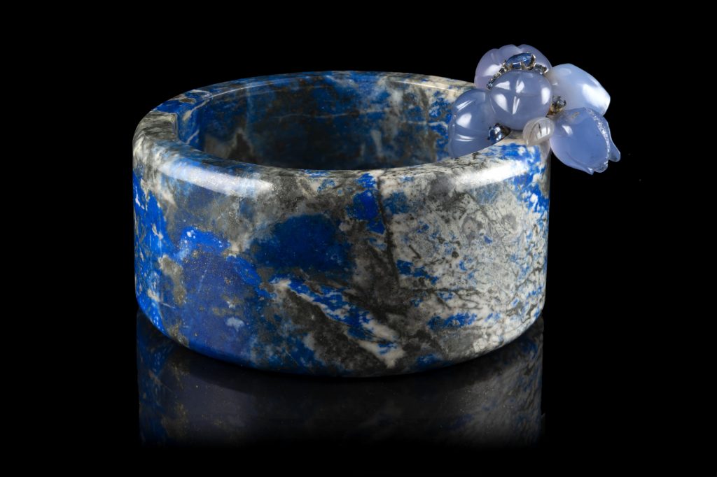 Ciotola in lapislazzulo, decoro a tutto tondo con melograni e foglie in calcedonio arricchiti da zaffiri. Firmata nel bordo (d. cm 8,5; h. cm 5)