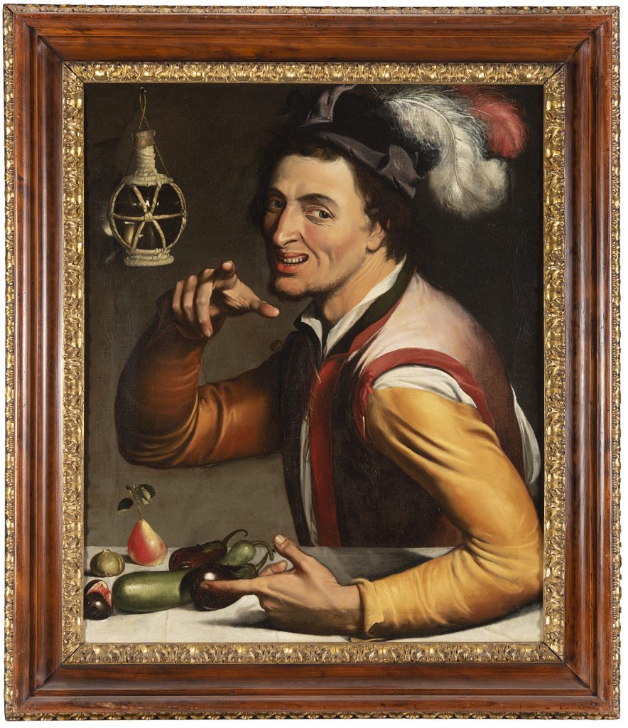 Ritratto di uomo con cappello piumato e composizione di frutta e ortaggi