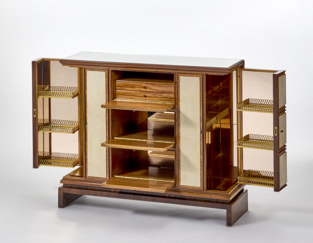 Mobile bar a corpo parallelepipedo con base a panchetta in legni diversi bordati e impiallacciati. Milano, 1940ca. (cm 120x100x36,5)