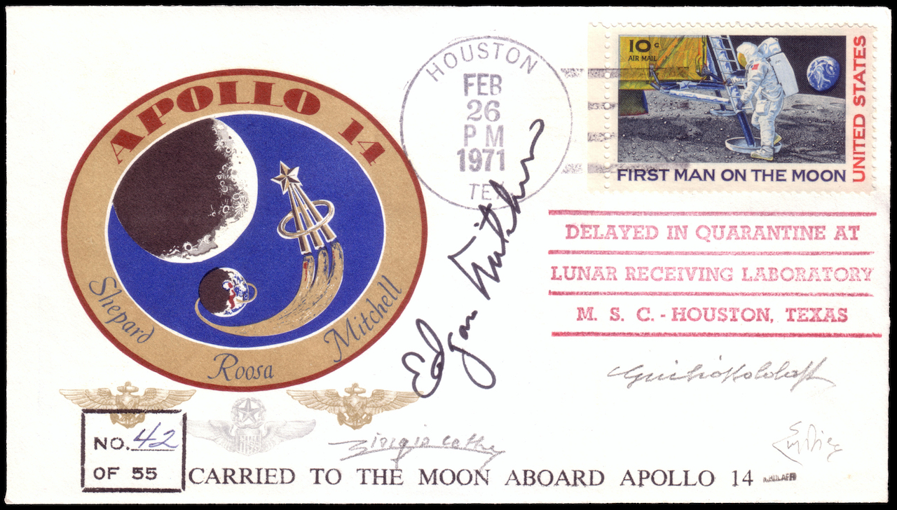 «Ho esaminato il Cosmogramma partito dal Kennedy Space Center il 31.1.1971 trasportato con il razzo “APOLLO 14” allunato il 5.2.1971 nel cratere di Frà Mauro», scriveva l’esperto Giorgio Colla lo scorso 20 Gennaio nella certificazione destinata alla casa d’aste. «La busta faceva parte di un dispaccio di 55 ed è la numero 42 come si evince dal fronte. Essa reca la firma di Edgar Mitchell Pilota del modulo Lem. Il Cosmogramma venne affrancato con un francobollo di P.A. degli U.S.A. da 10 centesimi del 1969. L’equipaggio di tre astronauti rientrò il 9.2. nell’Oceano Pacifico e dopo la quarantena a Houston il 26.2. le 55 buste vennero timbrate dall’Ufficio Postale del posto». E conclude: «A mio parere il Cosmogramma è originale […] e l’annovero tra le massime testimonianze della conquista della Luna».