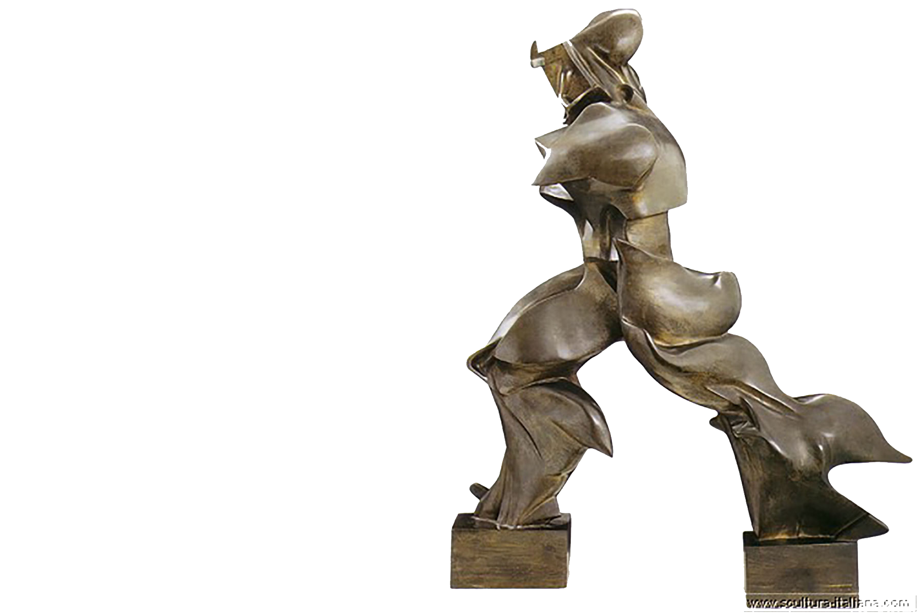 Dopo aver pubblicato il Manifesto tecnico della scultura Futurista, Boccioni non si era ancora completamente impegnato ad essere uno scultore e tuttavia. Alla fine dell’anno seguente, aveva scolpito un’opera così complessa che ora è considerata una pietra miliare del Futurismo e il suo capolavoro. Boccioni decise di rompere i blocchi della scultura e convertire il movimento in curve che si estendevano oltre la forma di un corpo umano, prima di riassemblarli come una figura in marcia in avanti. Due anni dopo aver realizzato questa scultura, Boccioni fu calpestato dal suo cavallo durante un allenamento di cavalleria con l’esercito italiano durante la Prima Guerra Mondiale. Morì all’Ospedale militare di Verona a soli 33 anni.