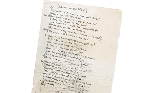 Non deve aver giovato a Bob Dylan il recente premio Nobel e le polemiche che ne sono conseguite, il testo manoscritto di Blowing in the wind, canzone bandiera delle rivoluzioni giovanili dagli anni ’60 ad oggi, ha di poco superato la stima bassa fermandosi a 324mila dollari.