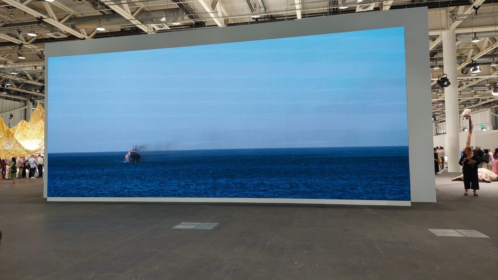 Una delle protagoniste è la Galleria Continua con Chromointerferent Environmen, l’installazione optical di Carlos Cruz Diez. L’idea è quella di proiettare nello spazio moduli di interferenza cromatica in movimento che coinvolga oggetti e persone. In questo modo l’artista mette in dialogo la natura “variabile” dell’interferenza cromatica con la “costante” rappresentata dalle ombre sulla parete. Anche il fuoco, l’elemento primario adottato da Adel Abdessemed, insieme all’acqua, sua controparte naturale, in Jam Proximus Ardet, la dernière vidéo (Già il vicino sta bruciando, l’ultimo video) rifiuta l’uso della narrativa tradizionale a favore di un’unica inquadratura facendola sembrare un’immagine in movimento. Una nave in fiamme si profila all’orizzonte, man mano che la nave si avvicina, ci rendiamo conto della presenza dell’artista, in piedi stoicamente sul ponte principale, apparentemente ignaro del trambusto che si svolge dietro di lui. Ricordando una delle opere più iconiche di Abdessemed, la fotografia Je suis innocent (2012), il video offre un’allegoria delle tragedie che deturpano il Mar Mediterraneo prendendo in prestito il titolo dall’Eneide di Virgilio, in cui il protagonista si rende conto che la città di Troia è in fiamme ed è destinato a distruzione certa. Nello stand Galleria Continua non si può non citare Ai Wei Wei che omaggia Leonardo Da Vinci con Last supper (blue) realizzato con i mattoncini Lego, parte della serie di lavori dedicati al Rinascimento, che punta alla digitalizzazione mediatica delle immagini.