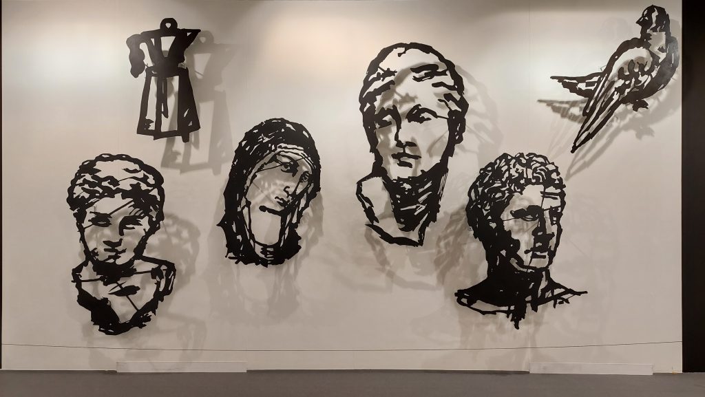 La galleria Lia Rumma, selezionata anche per Unlimited con un omaggio a Giovanni Anselmo dal titolo Mentre il colore solleva la pietra, la pietra solleva il colore, fa sentire la sua presenza con delle monumentali teste in ceramica di Vanessa Beecroft che con la loro anima antica sembrano scrutare il presente, un po’ come i ritagli di metallo nero di William Kentridge, appesi alla parete esterna dello stand, in cui le teste di Michelangelo e della Madonna guardano i passanti. La scritta ASPHALT AND LIMESTONE AND SAND KNEADED TOGETHER FOR ANY GIVEN TIME, troneggia nello stand di Alfonso Artiaco con Casa di Lucrezio di Giulio Paolini, quattro calchi in gesso interi e uno fratturato avvolti da tessuto nero. L’effetto è di sorpresa quando ci si ferma davanti lo stand di Franco Noero, che mette in esposizione una scultura parlante dalle sembianze semiumane di Simon Starling realizzata in legno e con una maschera che recita un testo ispirato alla figura di Fetonte, per Ovidio figlio del sole ed altri scrittori tra cui, soprattutto, Stephen Pyne.