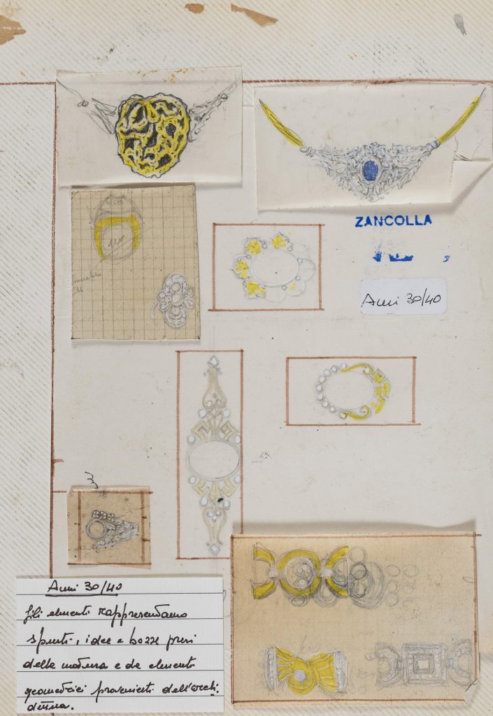 E approdiamo così al terzo appuntamento della maison romana, dedicato ai progetti e alle attrezzature tecniche per i gioielli realizzati da Giulio Zancolla. Disegnatore e costruttore per Bulgari dal 1933 al 1943, gestì a Roma fino agli inizi degli anni ’70 un laboratorio di oreficeria, poi passato agli eredi. Tra gli esemplari della casa d’aste scopriamo diversi strumenti necessari per il suo lavoro – da un Microscopio Zeiss (Lotto n.498) a un trapano da orafo (Lotto n.499) a una valigetta degli attrezzi (Lotto n.507), tutti degli anni ’30 – per arrivare infine ai disegni dei progetti per collier, spille e bracciali che scandirono con successo la sua intensissima carriera.