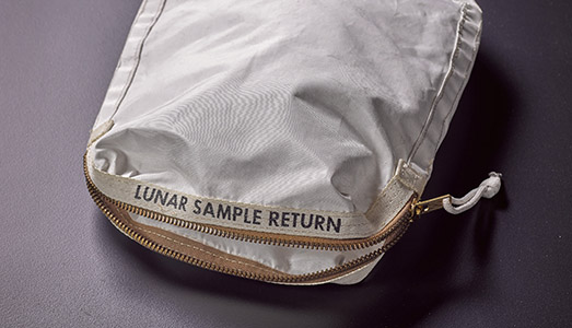 L’asta include un gruppo di oggetti associati a Apollo 11, l’apice dell’esplorazione spaziale. Uno di questi, forse il più importante è la cosiddetta borsa lunare: un sacchetto con cui Neil Armstrong raccolse i primi campioni di terreno lunare nel suo primo allunaggio. Dopo che Apollo 11 è tornato sulla Terra, quasi tutte le attrezzature della missione sono state inviate al Smithsonian, tutte tranne questa borsa. Tracce di polvere di luna e piccola roccia sono incorporati in quello che è l’unico artefatto della missione Apollo 11 in mani private.
