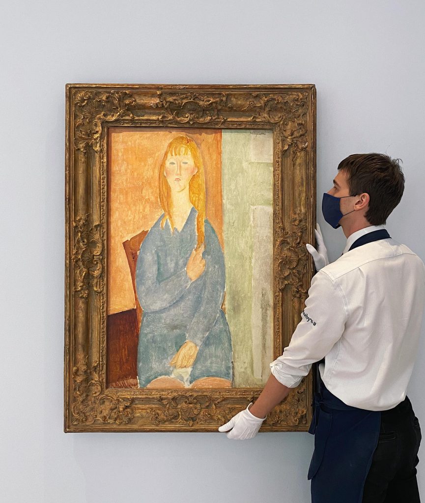 Siamo lontani dal record d’asta di Modì (Nu-couché, 152 milioni da Christie’s nel 2015), è vero, ma non è difficile capire perché Sotheby’s lo annunci come uno dei migliori ritratti tardivi dell’artista. Diamo uno sguardo al suo curriculum espositivo: già un decennio dopo la sua realizzazione, nel 1930, il mecenate Roger Dutilleul lo prestò alla Biennale di Venezia, dopo averlo acquistato direttamente da Modigliani; lo ritroviamo poi nelle grandi mostre in giro per il mondo, dal Museum of Modern Art di New York (1955) – dove era intitolato Fillette blonde en bleu – fino alla straordinaria retrospettiva alla Tate di Londra nel 2017, passando per la Tokyo Art Gallery e la Kunsthaus di Zurigo.