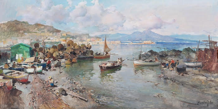 Un’asta composita, che abbraccia un bacino altrettanto ampio di collezionisti e appassionati. Ci sono anche dipinti antichi, come il seicentesco olio su tela raffigurante San Gennaro con angelo reggiampolle di Giovan Francesco De Rosa (detto Pacecco) (stima € 20.000/25.000) – un altro legame evidente con la città partenopea. E il tour Napoli continua con una serie di rare vedute di piazze e marine, firmate dai più importanti pittori locali protagonisti del Settecento e dell’Ottocento. Solo per rendere l’idea: Pietro Antoniani, Attilio Pratella, Felice Giordano, Salvatore Fergola, Giovanni Carlo Bevilacqua, Francesco Mancini, ma anche nomi della Scuola di Posillipo o di Scuola Napoletana del XVIII o XIX secolo.