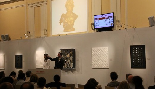 La casa d’aste austriaca Dorotheum ringrazia gli italiani e chiude la sua settimana di vendite di Arte Contemporanea con il sorriso e con la cifra più alta di sempre della categoria, insieme ad una manciata di altri record. Decisi a vincere facile i pezzi grossi della casa d’aste avevano annunciato la vendita di una serie di opere dell’avanguardia italiana degli anni sessanta, genere e annata ultimamente molto ricercate. A guidare la vendita è stato un lavoro di Enrico Castellani, una delle sue Superfici, che ha venduto per 965mila euro, un nuovo record per un dipinto di questa serie.
