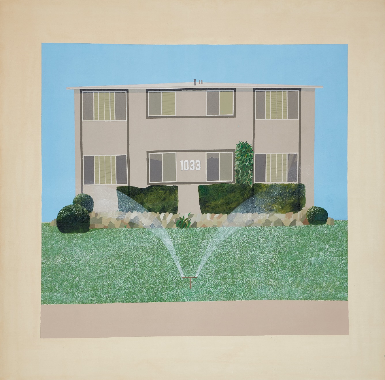 Qualche dettaglio sull’opera in vendita, dipinta in seguito alla prima visita di Hockney alla città di Los Angeles – dopo che per anni l’aveva ammirata, sognata e idolatrata solo sulle pagine delle riviste più glamour. A Neat Lawn – un prato ordinato – raffigura una casa che si staglia su un cielo blu brillante, con tanto di irrigatore in primo piano che riflette il suo interesse per l’acqua e la sua resa. Non un’abitazione di lusso in pieno stile hollywoodiano, è vero, ma attraverso lo sguardo dell’artista il cortile al 1033 di South Bedford Street si trasforma in un soggetto degno di dimensioni eccezionali. «A volte ci vuole uno straniero», diceva, «per venire a vedere un posto e dipingerlo».