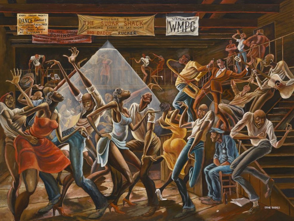 È successo di nuovo. Solid Rock Congregation (1993) di Ernie Barnes ha polverizzato tutte le aspettative sotto il martello incredulo dell’auctioneer di Bonhams, correndo veloce fino a quota $ 1,6 milioni. Il soggetto: una scena di chiesa della domenica mattina, quei corpi lunghi, affusolati, in movimento, le braccia alzate al cielo, le mani infinite, a tratti intrecciate. La stima di partenza? $ 500.000. È un déjà-vu, pensiamo, la storia è nell’aria. Ed eccola, basta scorrere indietro di 4 mesi sul calendario. Lo scorso maggio, da Christie’s, i corpi danzanti di The Sugar Shack (1976) – già protagonisti della cover di I Want You di Marvin Gaye – infrangevano senza indugi qualsiasi pronostico, moltiplicando per 76 la stima alta di $ 200.000, dritto e diretto fino al record di $ 15,3 milioni. Pochi giorni prima, sempre da Christie’s, la Storm Dance (1977) era volata da $ 100.000 fino al tetto di $ 2,3 milioni, mentre il 28 giugno, a Londra, Main Street Pool Hall (1978) ha fatto scintille con un’aggiudicazione da £ 1,5 milioni (la stima, lì, era di £ 80.000-120.000).
