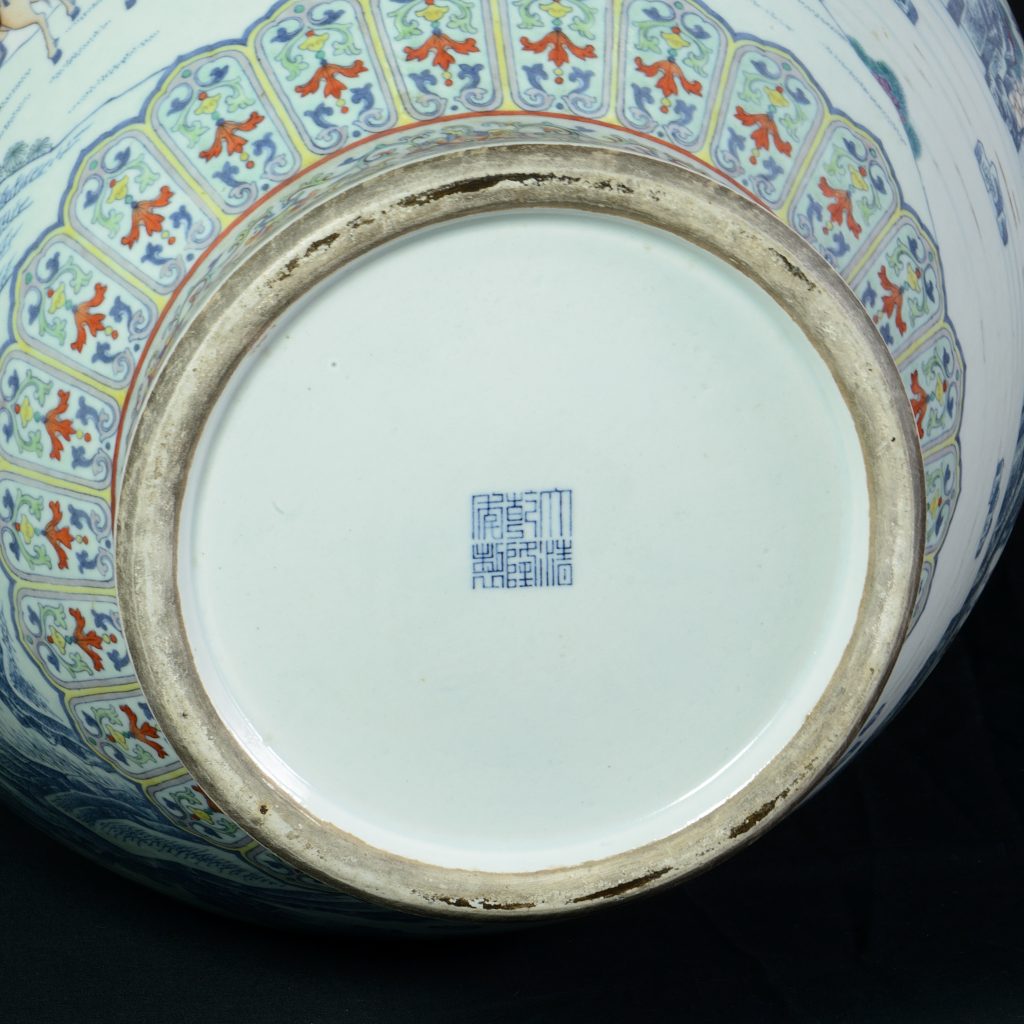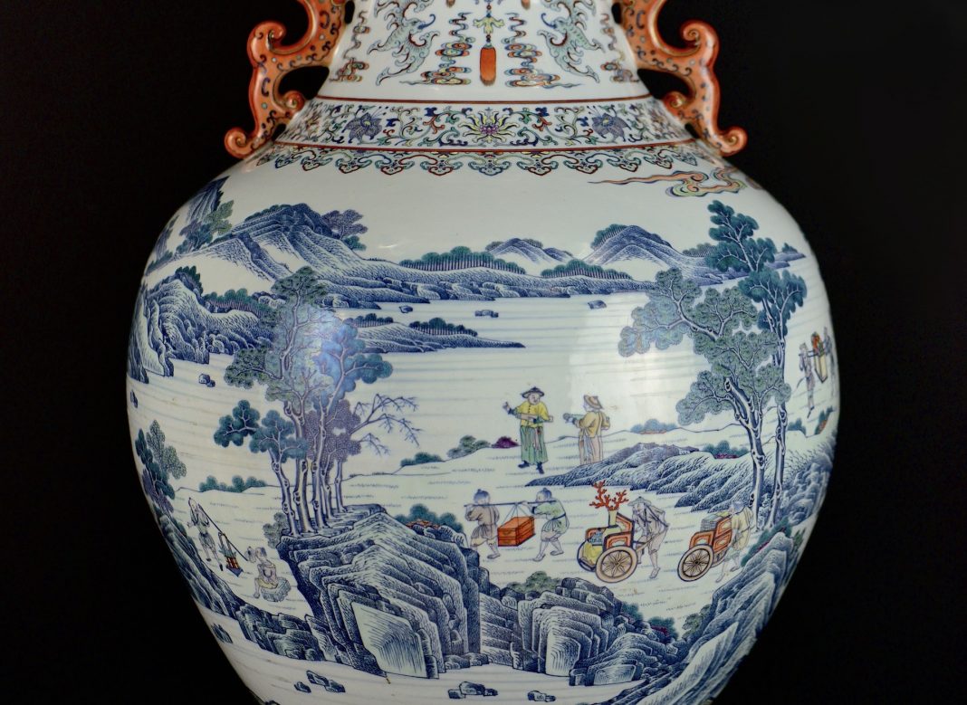 71,7 cm di altezza e un’analogia sorprendente con un esemplare della collezione del Museo del Palazzo di Pechino – a proposito di manifattura di un certo valore. È finemente decorato con smalti brillanti il lotto 1 di Casa d’Aste Martini, con smalto blu sottocoperta e lumeggiature in oro. Il collo, con doppie anse a guisa di testa di Idra, è impreziosito da pipistrelli, pesci, teqing e piccole nuvole colorate, simboli di buon auspicio, mentre la spalla riporta motivi floreali. La pancia è caratterizzata da personaggi che si muovono tra montagne e grandi nuvole colorate, intenti a trasportare tesori e tributi nella Città Proibita, alcuni accompagnati da cavalli altri da elefanti e altri da animali fantastici. Ancora un’elegante serie di motivi floreali sul piede. Sul fondo a smalto bianco, invece, ecco il marchio Qianlong a sei caratteri in blu. Il marchio d’eccellenza. «Si tratta di un vero e proprio capolavoro riemerso da una collezione privata, dove era utilizzato come semplice porta bastoni».
