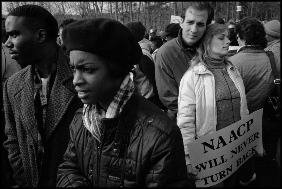 Sono inoltre presenti alcune fra le leggendarie fotografie scattate durante gli anni del Civil Rights Movement, come per esempio quella in cui Eve Arnold ritrae nel 1960 un gruppo di attivisti del Congress of Racial Equality riuniti a Petersburg, Virginia, durante un corso di formazione su come non reagire alle provocazioni bigotte dei bianchi. Oppure, più nello specifico, lo scatto di Bruce Davidson vede come protagonista un giovane ragazzo di colore ritratto durante la marcia di protesta del 1965 da Selma a Montgomery, Alabama. L’immagine è accompagnata dalle memorie del fotografo: «Martin Luther King Jr. conduceva un gruppo afroamericani, manifestanti non violenti, che protestavano per poter esercitare il loro diritto di voto costituzionale, a dispetto della repressione segregazionista. Questo fu un momento di svolta per il Civil Rights Movement. Sono finito di fianco a questo giovane manifestante, avvolto in una bandiera, dietro di lui c’era Padre Sherrill Smith di San Antonio, un prete bianco cattolico che per gran parte della sua vita ha protestato contro la disuguaglianza razziale».