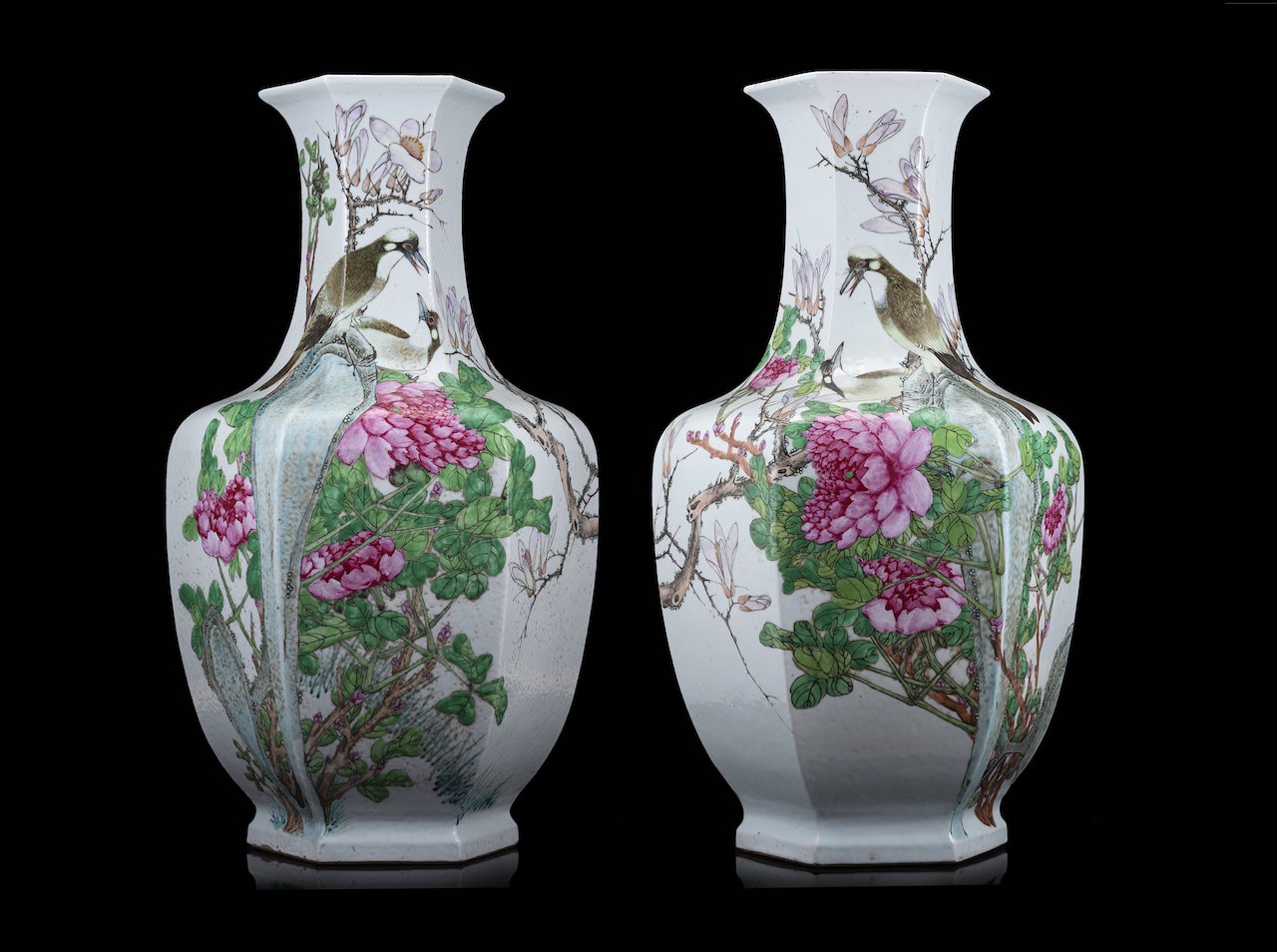 Il viaggio de Il Ponte ci accompagna così fino all’Ottocento, probabilmente – specificano gli esperti – fino al regno di Tongzhi. Incontriamo due grandi vasi esagonali qui, riccamente decorati, e quel motivo di pavoni e fagiani tra peonie e rami di pesco non è altro che un inno alla fortuna, alla longevità, alla carriera nei ranghi dei pubblici ufficiali dell’Impero (lotto 1518, stima € 4.000 – 6.000).