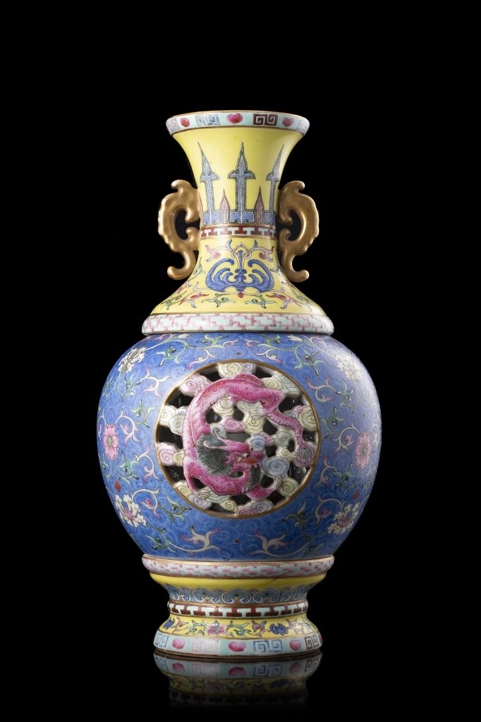«Ciò che vedi è sempre alle tue spalle?» – o meglio – «il tuo viaggio si svolge solo nel passato?», chiedeva Kublai Kan a Marco Polo, e il veneziano si precipitava a smentirlo con nuovi oggetti e parole. Anche l’asta di Palazzo Crivelli si avvicina al presente, fino ai tempi della Repubblica (1912-1949); è il caso di uno splendido vaso girevole, un esemplare in porcellana policroma e decoro traforato a figure di drago (lotto 1532, stima € 6.000 – 8.000). La particolarità? Reca alla base il marchio dell’imperatore Qianlong, omaggio dei maestri vasai alle incredibili porcellane di Jingdezhen realizzate sotto il suo regno.