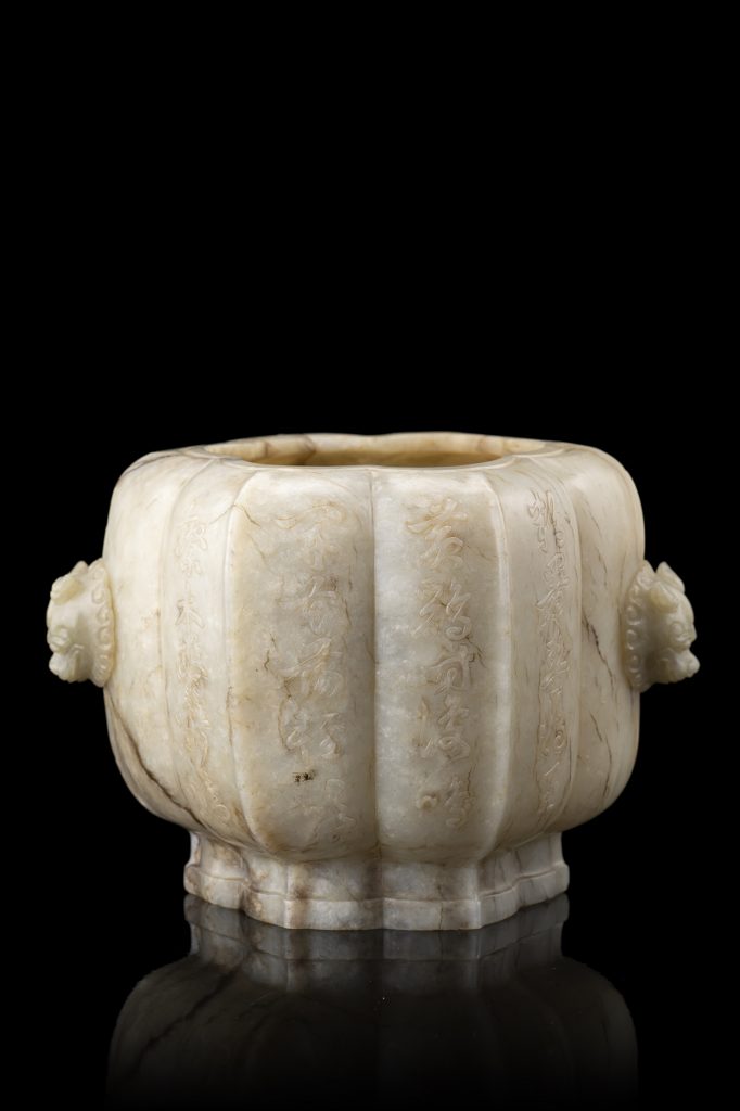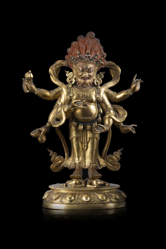 C’è la Cina della dinastia Ming, con la grande Guanyin assisa su fiore di loto in bronzo dorato, realizzata nel XVII secolo nelle pianure centrali, a sud del Fiume Giallo (lotto 1643, stima € 20.000 – 30.000); c’è un incensiere in giada grigio-verde screziata e dalla forma polilobata, con i lati scolpiti da incisioni poetiche (lotto 1640, stima € 2.500 – 3.000); e si fa un salto nel tempo, fino al XVIII secolo, con le due sculture in bronzo dorato che raffigurano Avalokitesvara (lotto 1635, stima € 8.000 – 10.000) e Mahakala (lotto 1548, stima € 1.500 – 2.000) – create entrambe a scopo devozionale.