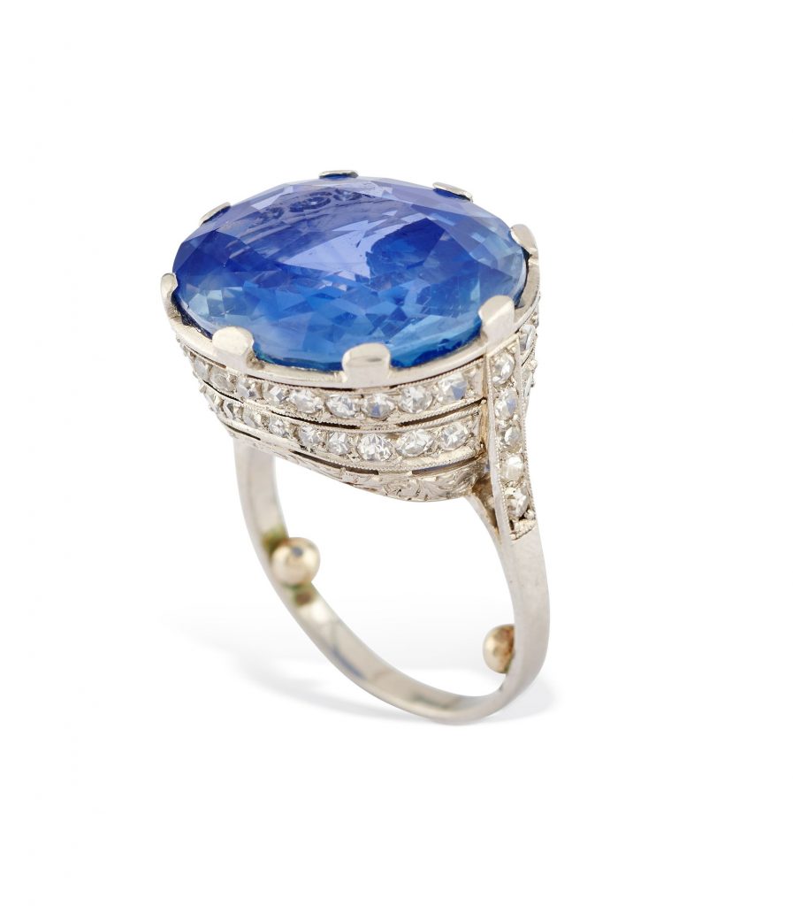 al centro grande zaffiro taglio ovale light blue di ct 21,00 circa, montatura d’epoca impreziosita da diamanti taglio huit-huit per totale ct 1,20 circa.