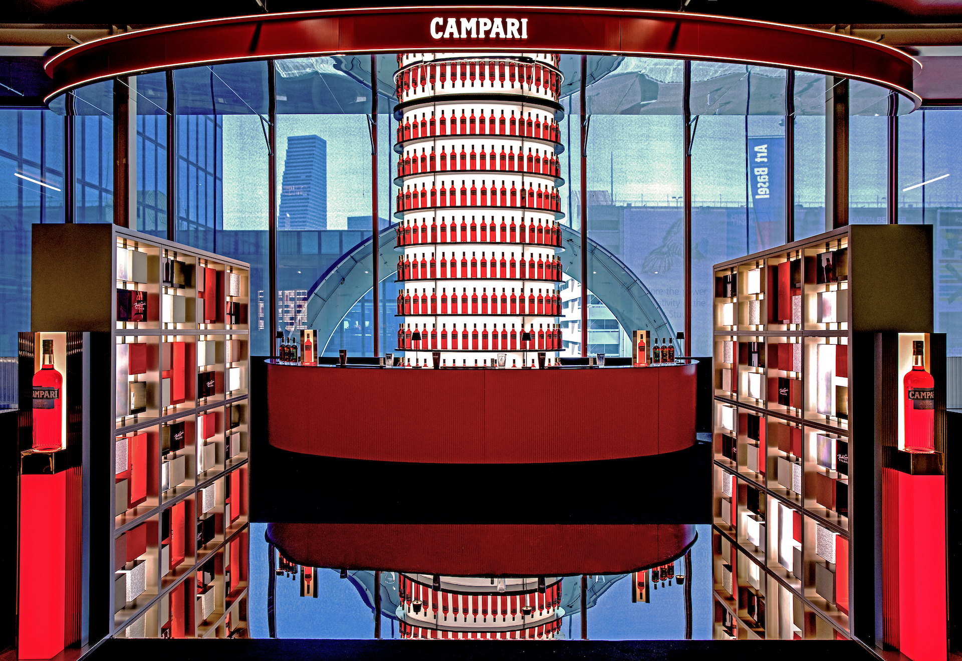 Sofisticata, riconoscibile, iconica. Color rosso fiammante, s’intende, fa il paio con il pavimento a specchio, con la torre di bottiglie Campari. Fino a domenica 18 giugno, il nuovo spazio del brand milanese ha accolto il pubblico tra le gallerie fameliche di Messe Basel – con tanto di appuntamenti speciali a partire, ogni giorno, dalle ore 17.00. Non è mancato ovviamente il link stretto con l’arte, come la maison meneghina ci ha abituati da oltre un secolo, con quelle collaborazioni con artisti come Fortunato Depero, Guido Crepax, Bruno Munari e un archivio storico che comprende oltre 4mila esemplari. Ed ecco quindi The Art of Mixology, il nuovo progetto in diretta dalla lounge: ad Art Basel, 3 famosi bartender hanno creato un’esperienza di gusto esclusiva, ispirandosi ad artisti contemporanei che hanno lavorato con il rosso, colore così caro alla maison.