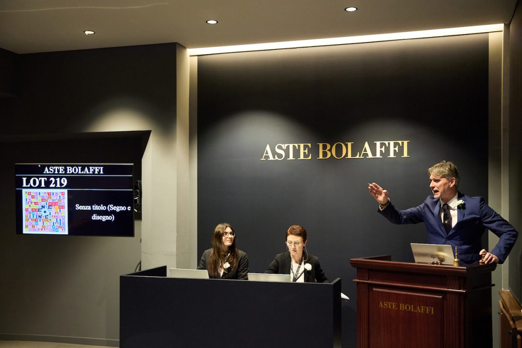 Buoni risultati sotto il martello di Aste Bolaffi, a Torino. L’incanto di arte moderna e contemporanea del 5 novembre ha registrato un totale di € 1,9 milioni (diritti inclusi) e una percentuale di lotti venduti che sfiora l’80%. Il top lot assoluto? L’arazzo Senza titolo (Segno e disegno) di Alighiero Boetti, anno 1978, protagonista di una serrata bidding battle tra tre collezionisti, dritto fino all’aggiudicazione finale di € 800.000. «Posizionandosi tra i top lot più importanti venduti negli ultimi anni da Aste Bolaffi», dichiara Filippo Bolaffi, amministratore delegato di Aste Bolaffi, «l’arazzo di Boetti conferma la nostra capacità di individuare opere d’arte di altissimo livello e renderle visibili ai compratori più raffinati ed esigenti a livello internazionale. Questo eccezionale risultato consolida la crescita della casa d’aste nel mercato dell’arte moderna e contemporanea, che rimane un asset class molto vitale in Europa e nel mondo».