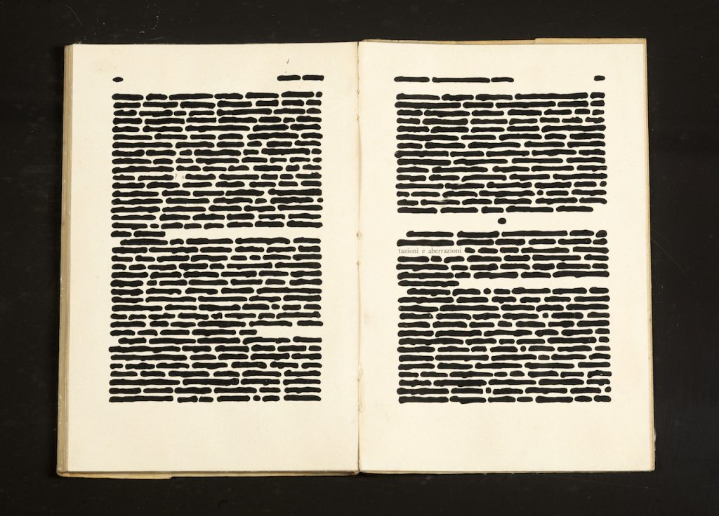 Cancellature su libro entro teca in plexiglas