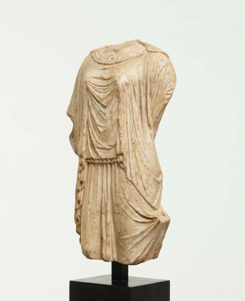 Una splendida Kòre in marmo, una “giovane ragazza” dell’antica Grecia datata I secolo a.C – I secolo d.C. Impiegate in genere come oggetti votivi, nei santuari o in corrispondenza delle tombe, queste giovani erano sempre rappresentate in piedi, con le gambe unite e con un peplo a nascondere il corpo, donando così un aspetto stilizzato. A Los Angeles è conservato un bellissimo esemplare del V secolo a.C. Al Tefaf, a New York, la Kòre sarà presentata da Galerie Chenel. A proposito di qualità museale.