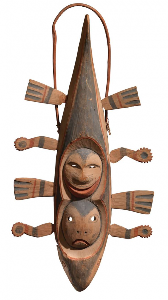 Una maschera magica allungata, a forma di pesce (o pseudo tale), con due pinne frontali, due facce, posseduta tra gli altri dall’artista surrealista Roberto Matta. È un’opera certosina realizzata dagli intagliatori Yup’ik, molto scrupolosi nella simmetria, nell’equilibrio e nell’armonia delle maschere, pensate per funzionare in universo multidimensionale. Le tre dimensioni visibili della maschera sono aumentate dai movimenti dei danzatori che le indossano. Al Tefaf New York 2024 sarà offerta da Donald Ellis Gallery.